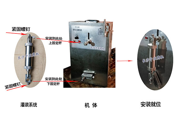 1、如下圖所示,將100ml專用不銹鋼灌 裝系統(tǒng)上下圓孔分別對準(zhǔn)上固桿,下固桿,
