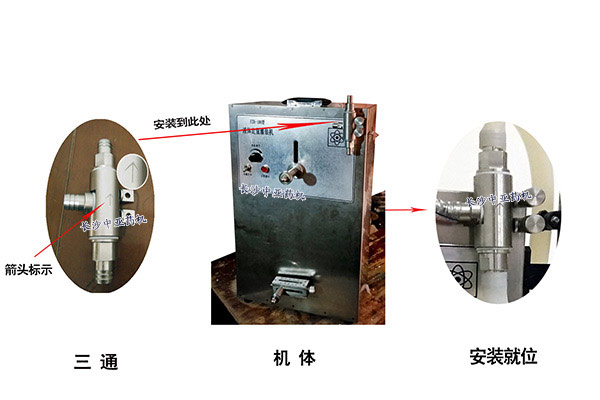 2 、如下圖所示,將三通閥門按箭頭標(biāo)示朝上安裝,箭頭標(biāo)記朝外用螺母固定于機(jī)體固定螺釘上。