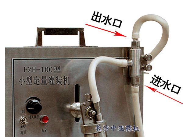 3、如下圖所示,用隨機(jī)的短膠管將灌裝系統(tǒng)和三通閥門連接嘴相接。進(jìn)液管道接進(jìn)水口,出液管道接出水口。