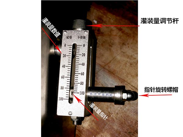 1、如下圖所示,首先旋松指針螺帽,然后調(diào)節(jié)灌裝量調(diào)節(jié)螺桿,使下固定桿的位置發(fā)生變化。