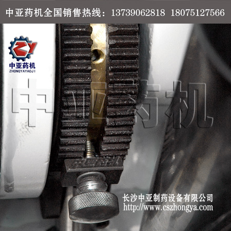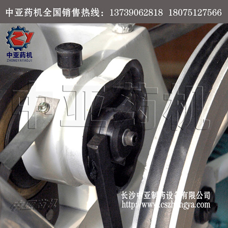 中草藥壓片機(jī)的主件為流線型機(jī)身,整體鑄造而成,裝配精度高,材質(zhì)優(yōu)良耐磨損,穩(wěn)定可靠。其上有主軸串連著三個(gè)心形凸輪,軸的右端裝有飛輪,附有活動(dòng)手柄,可作手搖調(diào)整工作,軸的左端裝有從動(dòng)齒輪,有電機(jī),通過(guò)皮帶輪由三角帶傳動(dòng)到小齒輪至從動(dòng)齒輪,帶動(dòng)主軸。主要工作過(guò)程分為:A.充填;B.沖壓成型;C.出片。三道程序連續(xù)進(jìn)行,其每道程序均可調(diào)節(jié),適合各種元件及片劑的制造需求。